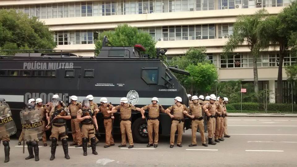 Essa é uma das cenas que entrará para a história política do Paraná. Inacreditávelmente os deputados governistas se submeteram a uma situação dessas: Chegar a ALEP dentro de um carro de polícia que lembra o “Caveirão” do BOPE do Rio de Janeiro.