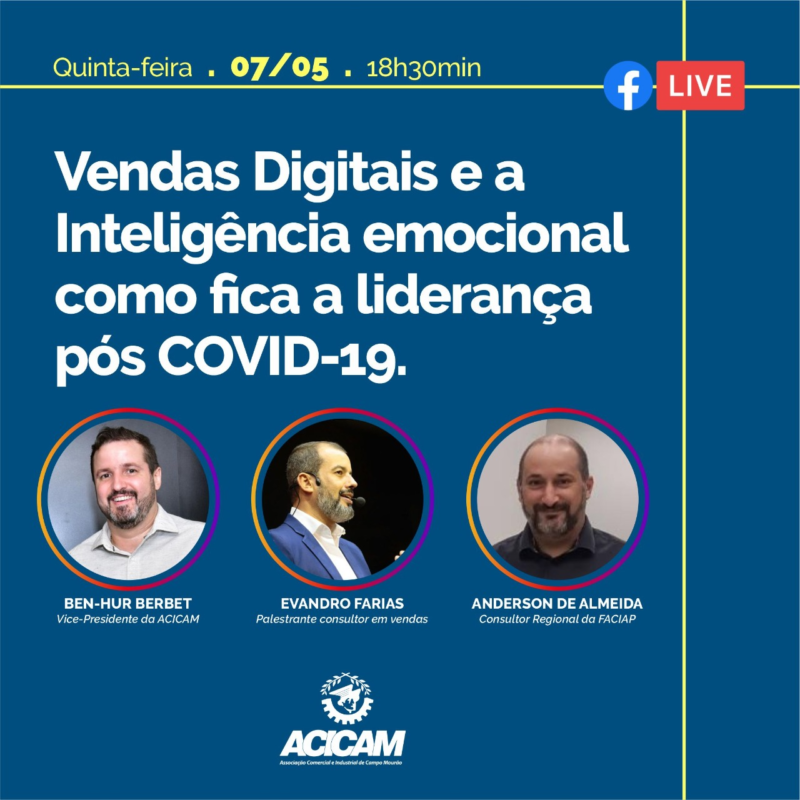 “Vendas Digitais e a Inteligência emocional como fica a liderança pós Covid-19” é o tema da live que a Associação Comercial e Industrial de Campo Mourão (Acicam) realiza pelo facebook nesta quinta-feira (7/5), a partir das 18h30min. Para acompanhar, os interessados devem acessar: facebook.com/acicamcm