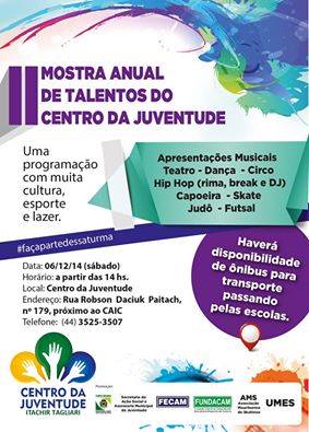 No dia 06 de dezembro (sábado) das 14h às 18h o Centro da Juventude promove a II Mostra Anual de Talentos.