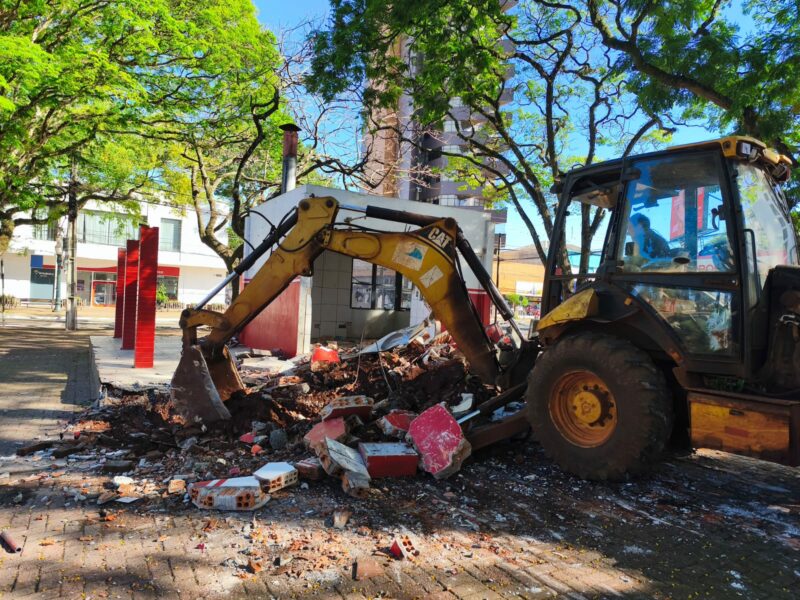Foi demolido na manhã desta terça-feira (21), o antigo quiosque na Praça São José, na esquina da Avenida Capitão Indio Bandeira com a Rua Harrison José Borges. A demolição da estrutura, construída no início da década de 1980, faz parte do projeto da prefeitura de Campo Mourão de revitalização das praças centrais.
