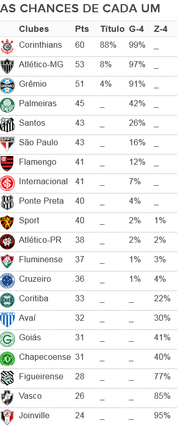 O GloboEsporte.com publicou nesta segunda-feira, 28, as chances de cada time da série A em relação a disputa do título, do G-4 ou ainda do Z-4 (figura ao lado).