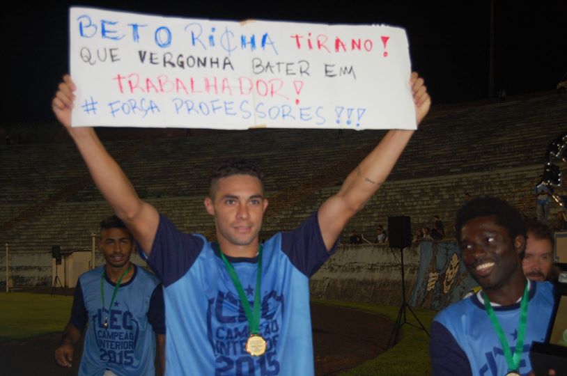 Uma imagem diferente vindo dos campos de futebol. Após conquistar o título do interior do Campeonato Paranaense de Futebol, alguns jogadores do Londrina apareceram em uma foto em que o cartaz diz: “Beto Richa tirano! Que vergonha bater em trabalhador! Força professores! (foto).