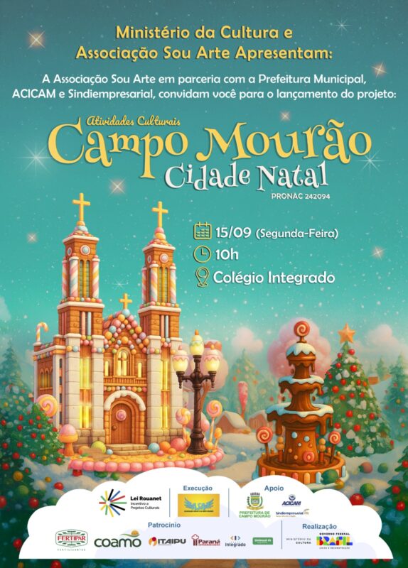 A Associação Sou Arte (ASA) realiza nesta segunda-feira (15), às 10h, no auditório do Colégio Integrado, o lançamento oficial do projeto “Atividades Culturais Campo Mourão – Cidade Natal/2025”. O evento marcará o início dos preparativos para a oitava edição do programa, que desde 2017 reinventou e se tornou a principal agenda das comemorações natalinas no município.
