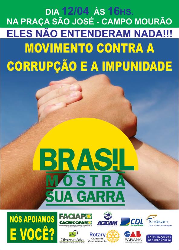 Uma série de entidades de Campo Mourão estão convocando para o dia 12 de abril um novo protesto que deverá levar bastante gente as ruas do município. O protesto está marcado para começar as 16h na Praça São José.