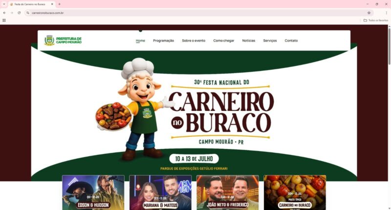 A tradicional Festa Nacional do Carneiro no Buraco, um dos eventos mais tradicionais de Campo Mourão, acaba de ganhar um site oficial. A plataforma já está no ar e pode ser acessada pelo endereço www.carneironoburaco.com.br, reunindo todas as informações sobre a 30ª edição da festa, que será realizada de 10 a 13 de julho, no Parque de Exposições Getúlio Ferrari.