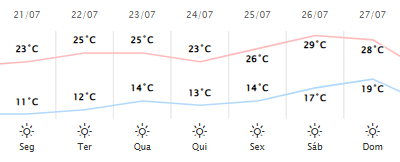 Na quarta-feira (23), as temperaturas se estabilizam, variando entre 14°C e 25°C, com ventos um pouco mais intensos e céu limpo. A partir de quinta (24), o vento muda de direção, passando a soprar do leste com rajadas mais fortes, chegando a 50 km/h, enquanto a temperatura registra leve queda na máxima, que volta para 23°C.