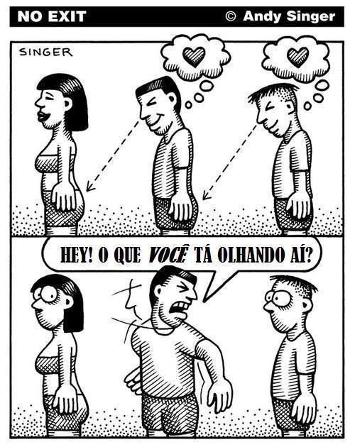Sobre estar sozinha, mulheres que andam na companhia de mulheres e homens também passam por esse tipo de violência. Quando o homem é o namorado, com frequência o agressor pede desculpas a ele, o que perpetua outro esteriótipo: o de que a mulher é pertencente ao homem. E isso precisa mudar. É como o quadrinho que ilustra esse texto mostra: homens não aceitam serem assediados por outros homens, porque fazem com as mulheres?