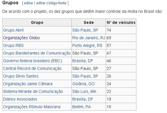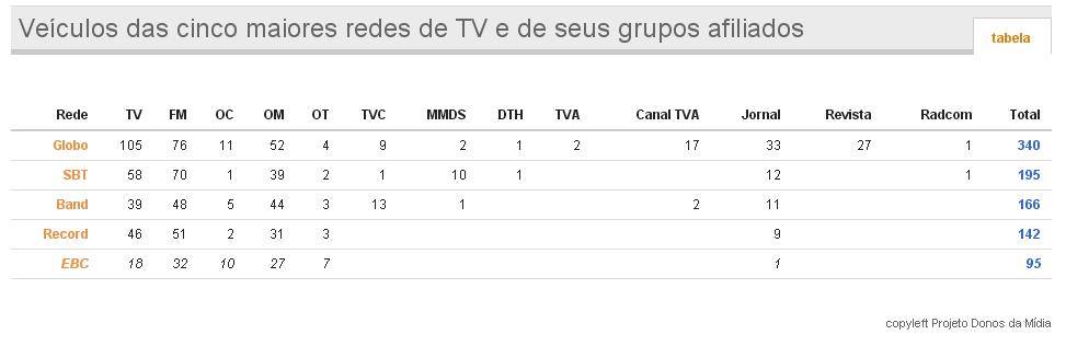 Veicúlos de comunicaçãoNote que os Grupos Organizações Globo e o Grupo RBS são associados (a RBS é a afiliada da Globo para os estados de SC e RS) e esses números referem-se a rádios, TVs, jornais, revistas, etc.