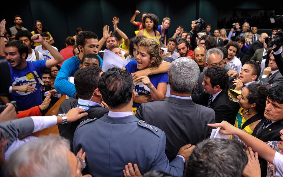 A presidente da UNE se mostrou indignada e acusou parlamentares de chama-la de “vagabundo” e mostrou os braços vermelhos causados por empurrões.