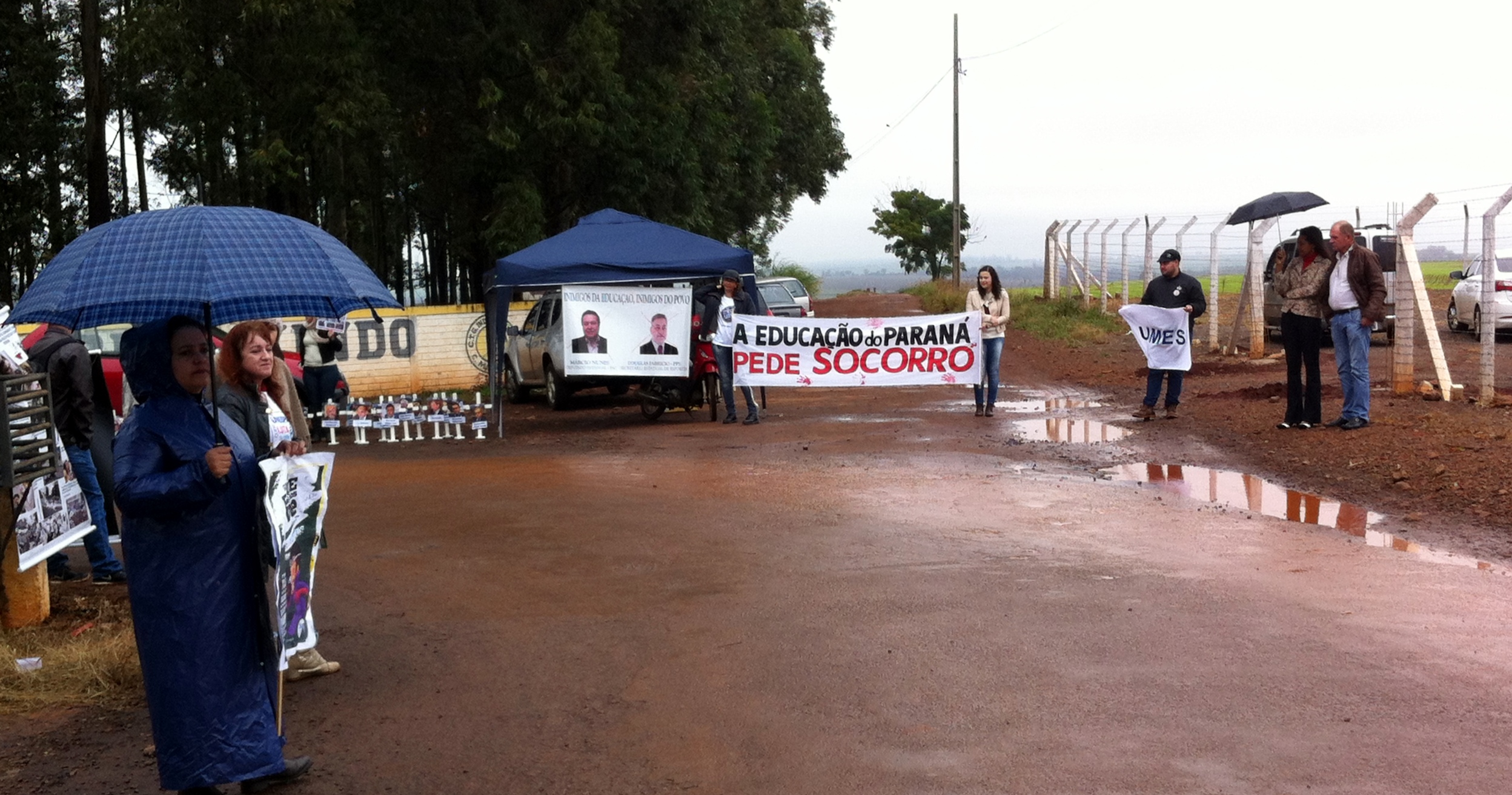 Um grupo de professores fez protesto na entrada da Porco Fest, em Campo Mourão. O evento aconteceu no último domingo, 31, e eram esperadas as presenças dos deputados Márcio Nunes (PSC) e Douglas Fabrício (PPS), que também é Secretário de estado do Esporte e Turismo no governo Richa.