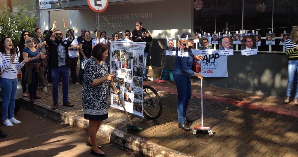Os educadores lavaram a calçada em frente ao prédio, em gesto simbólico para lavar a corrupção no órgão, que em Londrina é acusado de desvio de dezenas de milhões de reais.