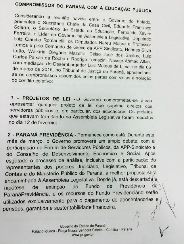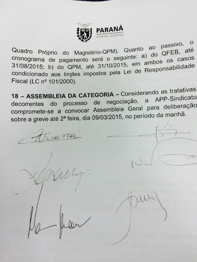 A mediação foi pedida pela própria APP Sindicato. Ao final uma carta compromisso foi assinada por ambas as partes (imagens) e o sindicato da categoria se comprometeu em realizar uma Assembleia Geral na segunda-feira, 9, quando o movimento completa exatamente um mês efetivo.