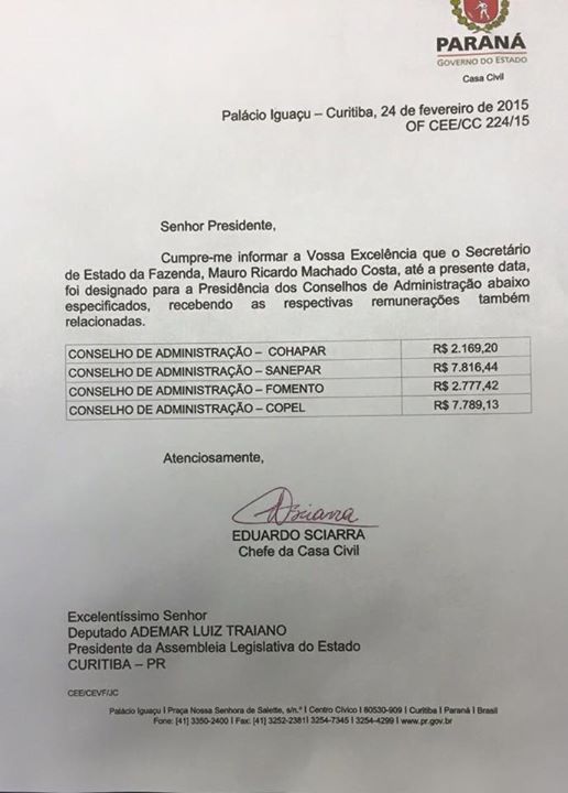 Isso porque Costa acumula a presidência dos conselhos de administração da Cohapar, Sanepar, Fomento e Copel, conforme carta enviada pelo chefe da Casa Civil de Richa, Eduardo Sciarra, ao presidente da ALEP, Ademar Traiano (o mesmo que disse que sugeriu que professores tem benefícios de mais)