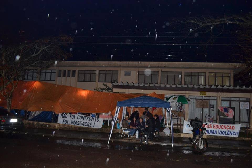 Professores e funcionários da rede pública estadual tiveram mais uma provação nesta última terça-feira, 26. Além de estarem acampados em frente aos núcleos de educação, sem nenhum tipo de acomodação, choveu muito durante a noite de ontem e a madrugada de hoje em diversas cidades do estado.