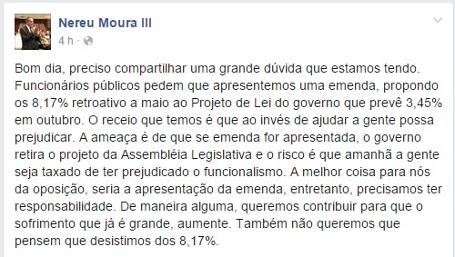 O Deputado Estadual Nereu Moura (PMDB) publicou nota em seu perfil pessoal no Facebook perguntando sobre uma dúvida dele e de outros parlamentares sobre se apresentam ou não emenda da reposição de 8,17% retroativo a maio no projeto original do governo do estado que prevê o índice de 3,45 em outubro.
