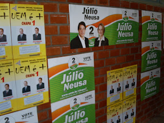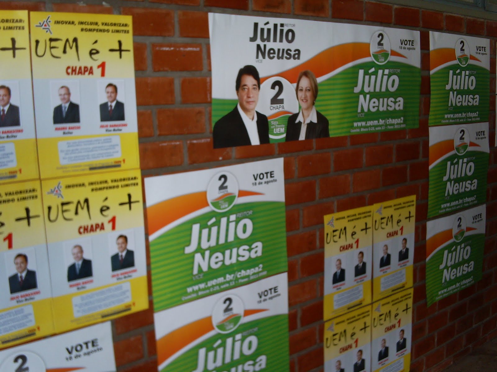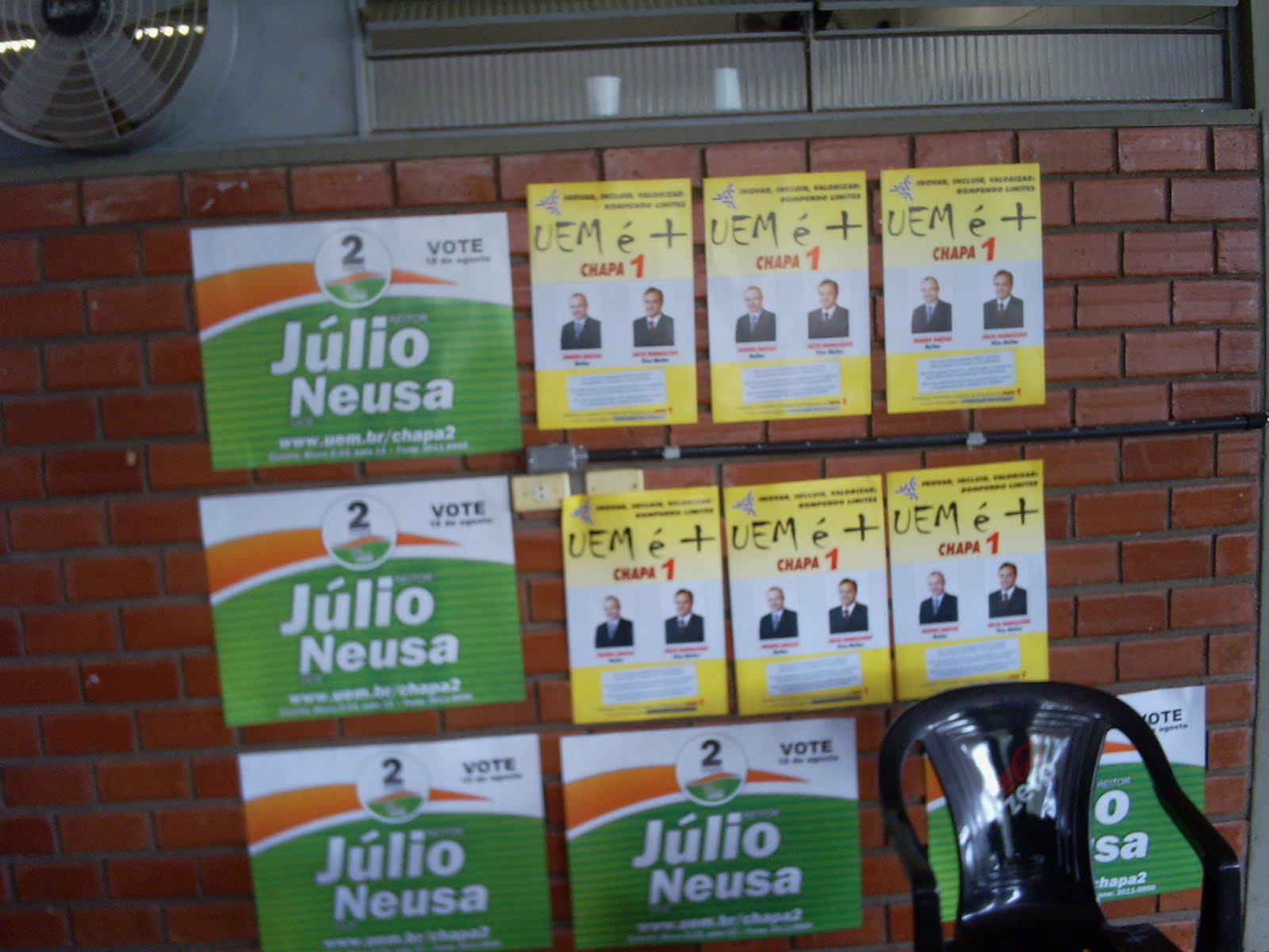 Andando hoje pela UEM pude perceber que em várias partes do campus existem cartazes das duas chapas que disputam a reitoria pregados nas paredes (fotos). É eleição e isso é rotineiro para nós.