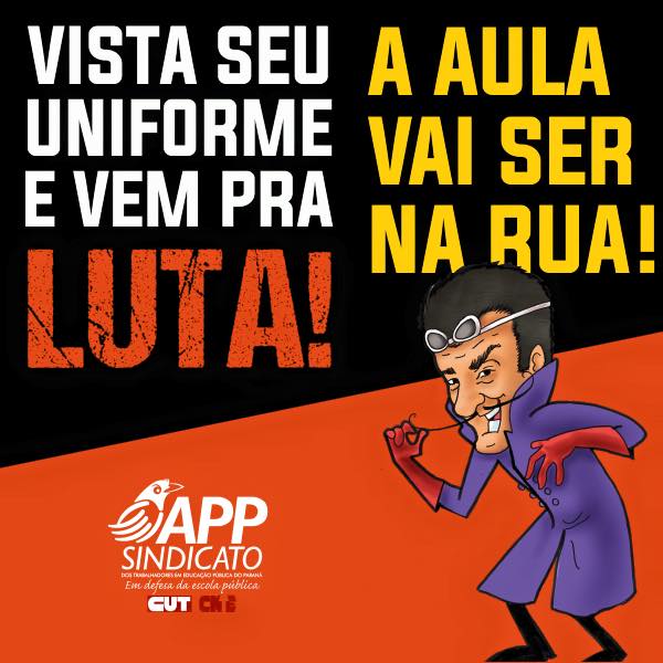 “Teremos uma grande aula de democracia e de cidadania. Professor(a) e funcionario(a), vista seu jaleco. Estudante, vista seu uniforme e venha conosco marchar em defesa da educação pública. Pais, mães, responsáveis, venham com a gente nessa luta”, convoca a APP.