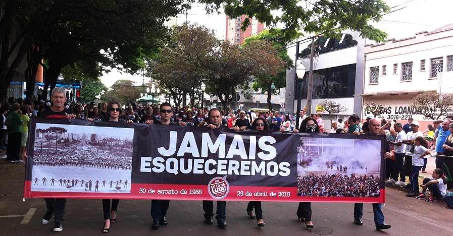 Em Campo Mourão, por exemplo, muitos educadores desfilaram com camisetas que lembrar a fatídica data, quando cerca de 200 pessoas ficaram feridas em uma ação truculenta do governo.