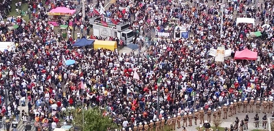 São milhares de trabalhadores vigiados de perto por policiais militares que estão no local. Filmagens mostram, inclusive, o helicóptero da polícia fazendo voos em altitude muito baixa e intimidando o povo paranaense.