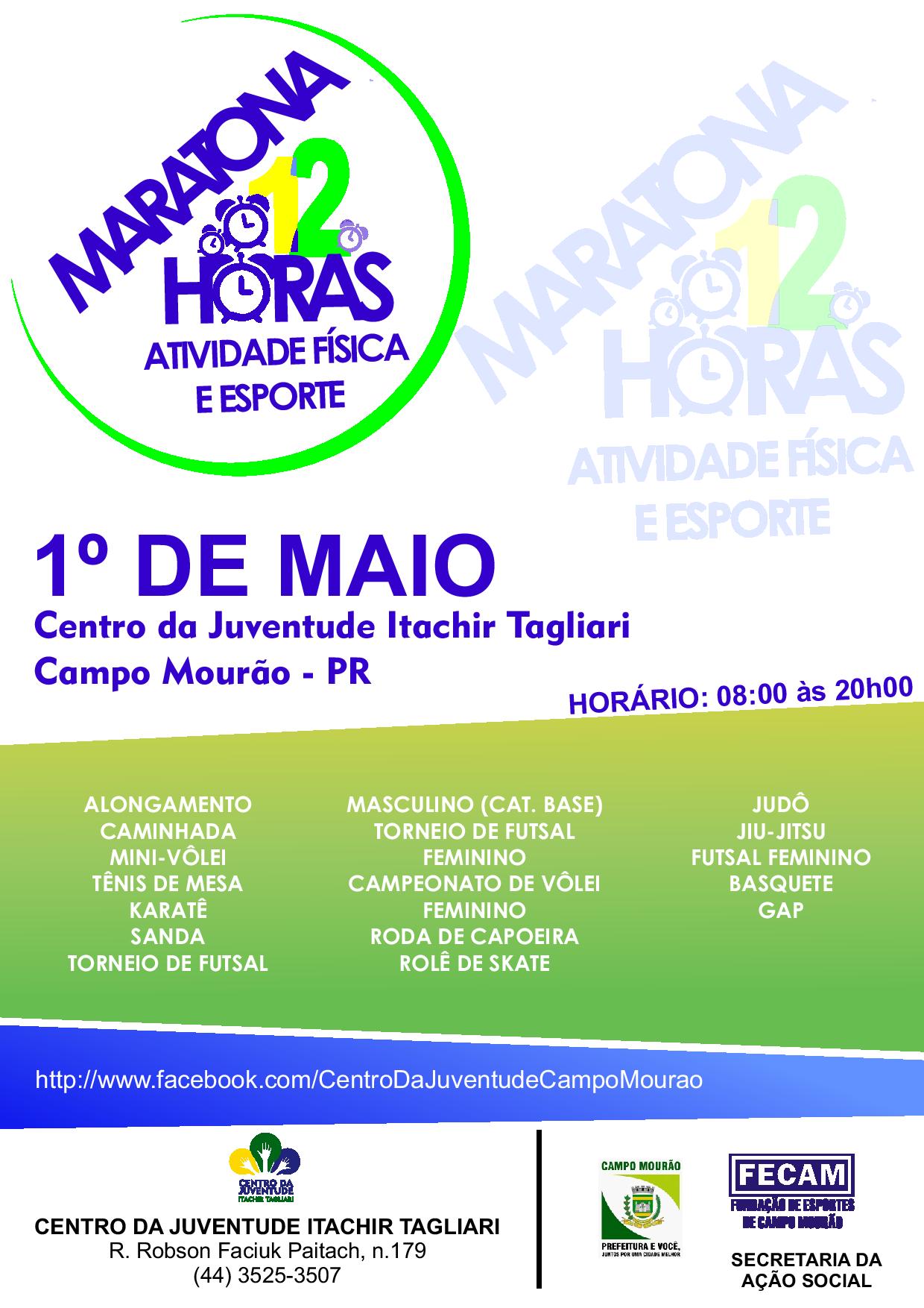O Centro da Juventude Itachir Tagliari, de Campo Mourão, realizará no dia 1º de Maio, a 2ª edição da “Maratona 12 Horas de Atividade Física/Esporte”. Trata-se de um evento que reunirá várias modalidades esportivas, atividade física, horas de lazer e prevenção a saúde, tudo isso entre 07h15 e 20h00, sem intervalo. A estimativa para esse ano é que 700 pessoas participem das atividades, sendo crianças, jovens, adolescentes, adultos ou idosos, e toda as ações são gratuitas.