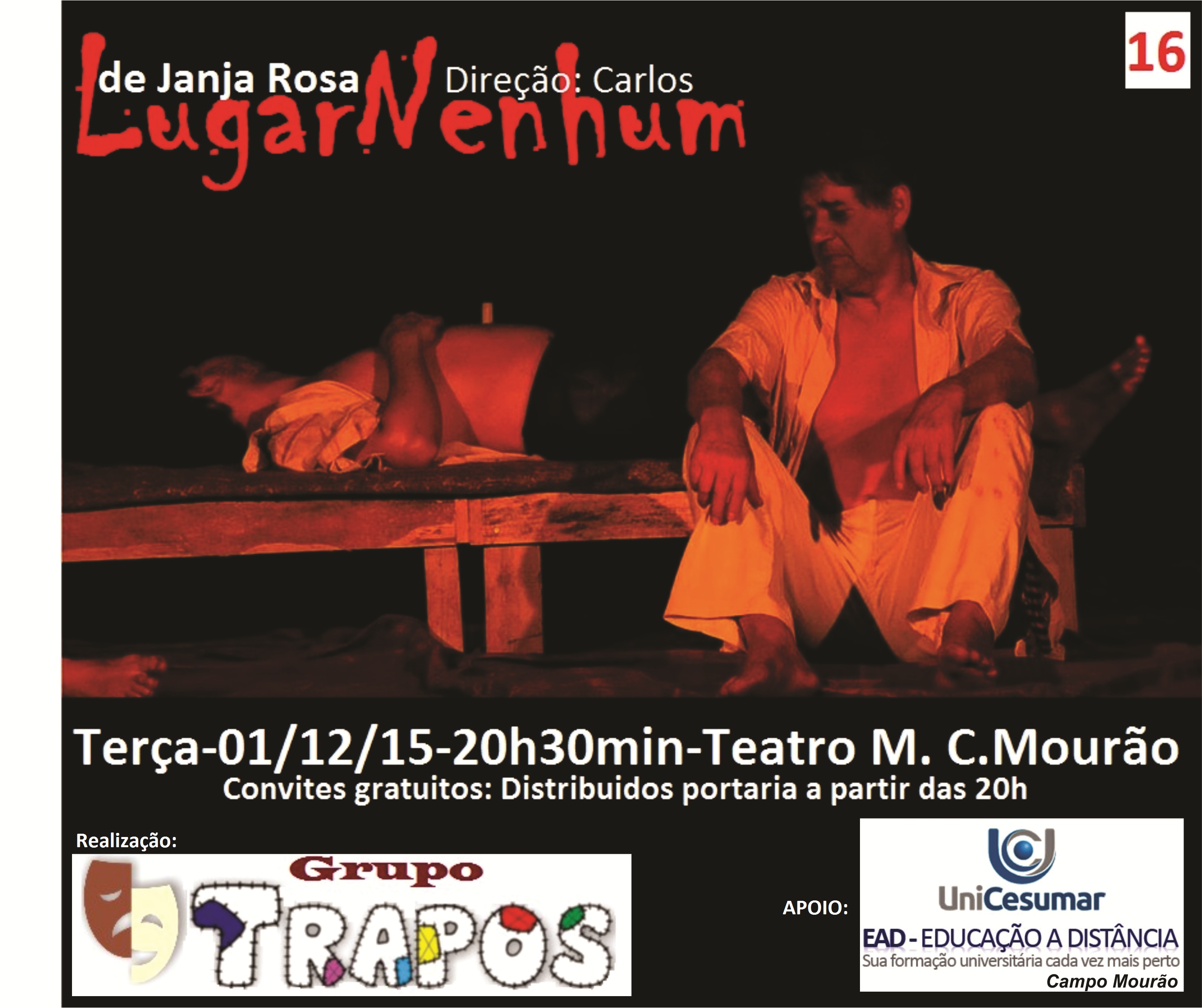 O Grupo Trapos de Teatro, apresenta nesta terça-feira, 1º, o espetáculo Lugar Nenhum. A apresentação acontece no Teatro Municipal de Campo Mourão, a partir das 20h30.