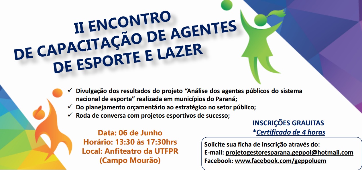 Acontece em Campo Mourão no dia 6 de junho o 2º Encontro de Capacitação de Agentes de Esporte e Lazer. A atividade, que será realizada no auditório da UTFPR, tem como objetivo capacitar gestores e agentes de esporte e lazer.