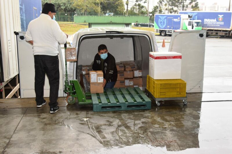 As vacinas começaram a ser descentralizadas no período da tarde e devem ser encaminhadas do Centro de Medicamentos do Paraná (Cemepar) para as 22 Regionais de Saúde por via terrestre em razão das condições climáticas adversas na Capital.