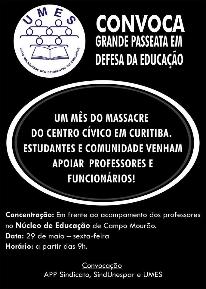 A mobilização em Campo Mourão acontece no Núcleo Regional de Educação. Já em Curitiba, a UPES também convoca e a mobilização será na Praça Santos Andrade.