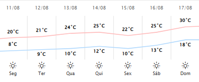 A previsão indica tempo estável, sem ocorrência de chuvas, e predomínio de sol em todos os dias da semana. Pela tarde, as temperaturas devem ficar mais agradáveis, contrastando com o frio das primeiras horas.