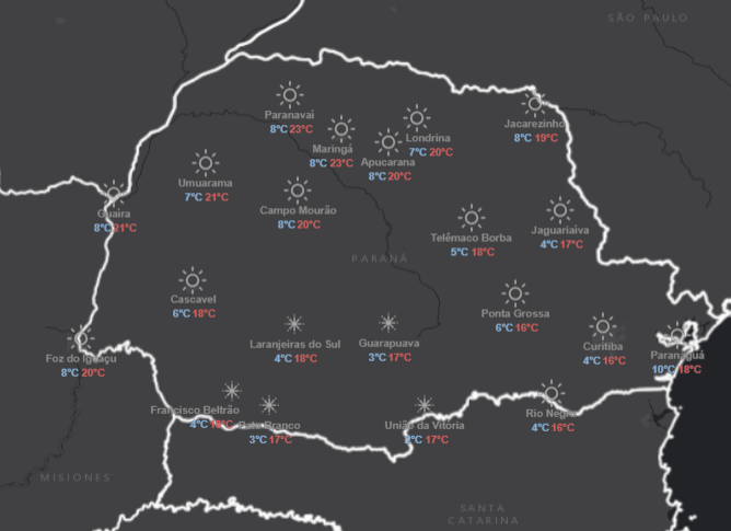 Campo Mourão inicia a semana com temperaturas baixas nas primeiras horas do dia, mas a tendência é de elevação gradual ao longo dos próximos dias. De acordo com o Sistema de Tecnologia e Monitoramento Ambiental do Paraná (Simepar), o céu limpo durante a madrugada e manhã favorece a perda de calor da superfície para a atmosfera, o que intensifica o frio no amanhecer e provoca grande amplitude térmica.