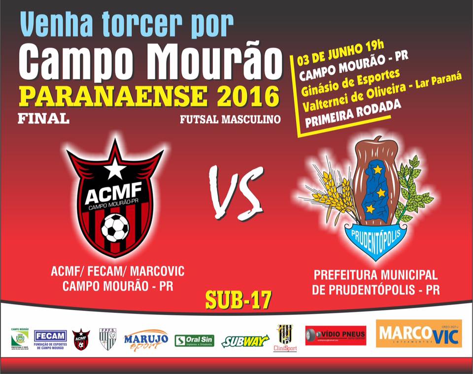 Final de semana de muito futsal em Campo Mourão. A bola começa a rolar nesta sexta-feira (03) no ginásio Valternei de Oliveira (Lar Paraná) com o inicio da fase final da Taça Paraná Sub-17, reunindo as quatro melhores equipes da categoria no Estado: Campo Mourão Futsal; Colégio São Francisco Xavier, de Maringá; Medianeira Futsal e Prudentópolis Futsal. Nesta sexta, ás 19h00 a ACMF inicia a busca pelo bicampeonato (foi campeão em 2015) contra Prudentópolis. Na sequencia jogam Maringá e Medianeira. A segunda rodada acontece na tarde de sábado e a última na manhã de domingo.