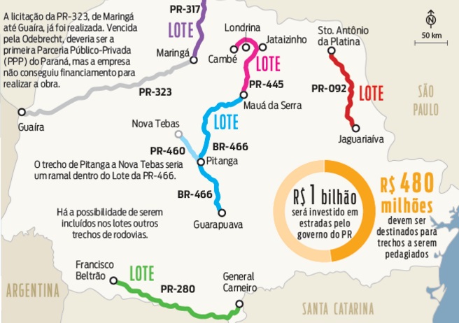 Esse valor está na proposta orçamentária enviada à Assembleia Legislativa do Paraná para 2016. O total de investimento em rodovias deverá chegar a R$ 1 bilhão. O maior valor previsto gasto será no contorno de Londrina, com cerca de R$ 107 milhões. O novo contorno fará parte do lote de pedágio na PR-445. Outros trechos que o governo quer conceder à iniciativa privada estão na PR-280, na , na PR-317 e na PR-466, de acordo com informações divulgadas pelo jornal Gazeta do Povo.