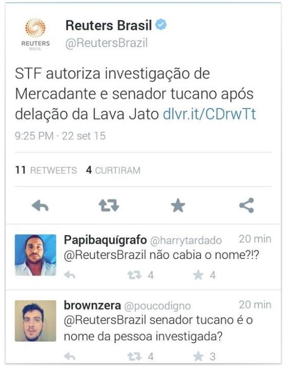No entanto, para variar, o tratamento não foi o mesmo para os envolvidos. Enquanto Mercadante teve seu nome lançado nas manchetes das principais agências de notícias, Nunes, foi substituído pelo genérico “senador tucano” como no caso da Reuters Brasil (imagem). Claro que houve reações dos internautas pela parcialidade como foi dada a notícia.