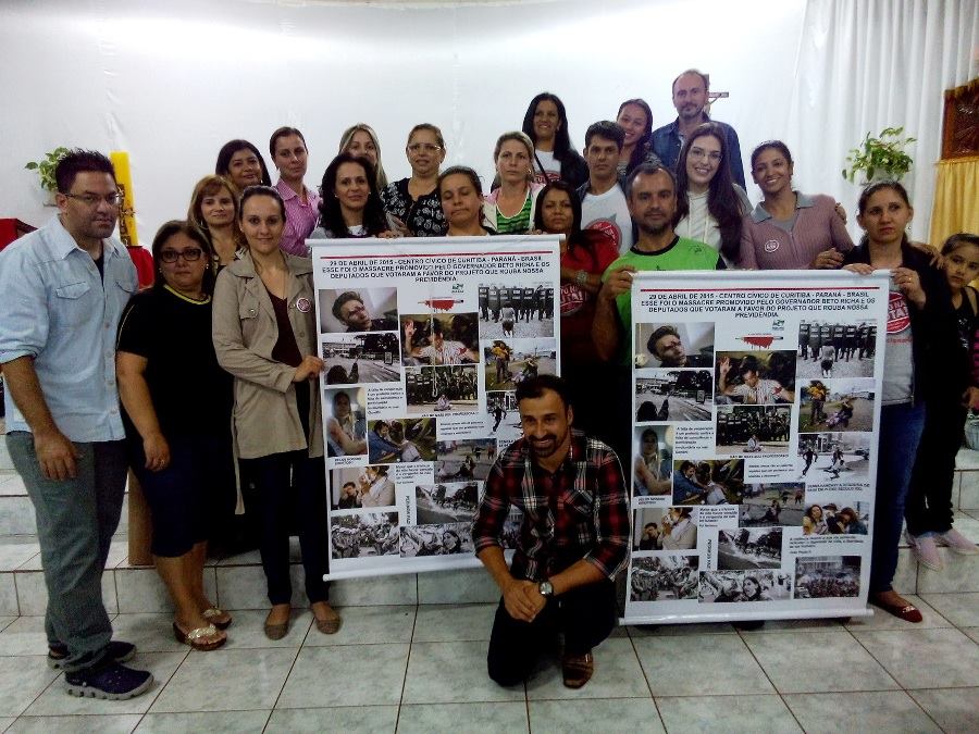 Os educadores levaram fotos e faixas sobre o movimento e do Massacre do dia 29 de abril para mostrar a comunidade e receberam o carinho do padre e também dos fiéis que se colocaram ao lado da luta dos professores e funcionários paranaenses.