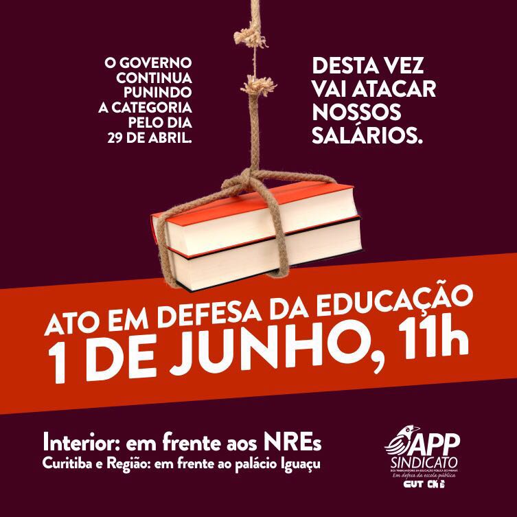 A APP marcou protesto em frente a todos os núcleos regionais de educação e também em frente ao Palácio Iguaçu. Todos os atos estão marcados para as 11h.