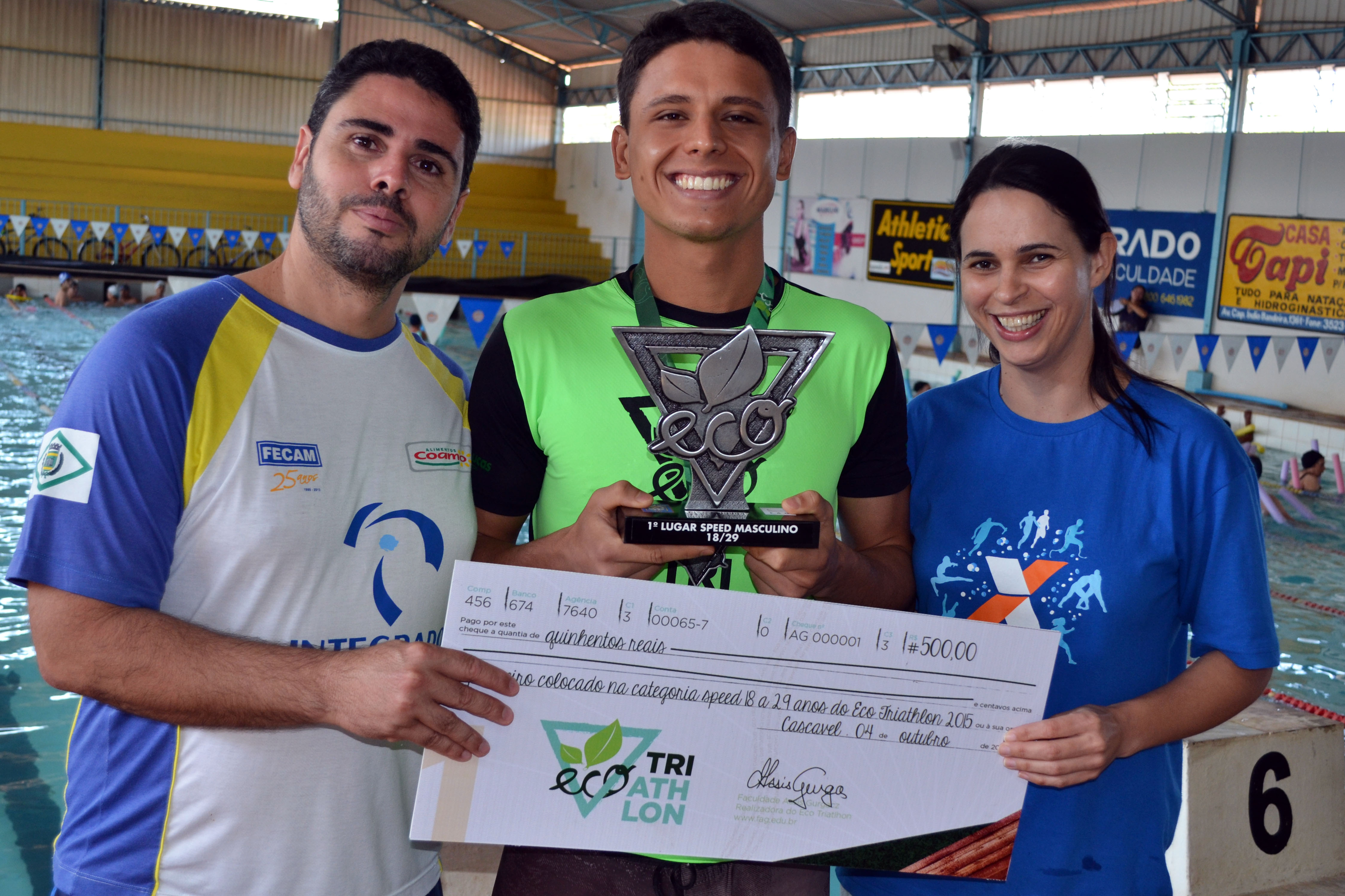Henrique SilvérioO atleta Henrique Pedroso Silvério, da Equipe de Natação do Município de Campo Mourão, foi o primeiro colocado, na categoria speed (18 a 29 anos), do Eco Triathlon, realizado no último domingo em Cascavel, na Região Oeste do Estado. Com 20 anos, ele nadou 750 metros, pedalou 20 quilômetros e correu outros cinco quilômetros. De acordo com o mesmo, o percurso foi bem forte, o que deixou a disputa bem pesada e complexa, com um nível bem alto.