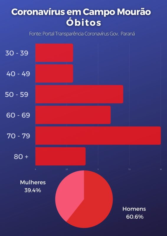 As mulheres continuam sendo as mais atingidas em Campo Mourão. Elas representam 53,9% dos casos, enquanto os homens somam 46,1%. A situação se inverte quando se fala em óbitos. As mortes têm acometido mais os homens na cidade, 20 dos 33 confirmados são do sexo masculino.