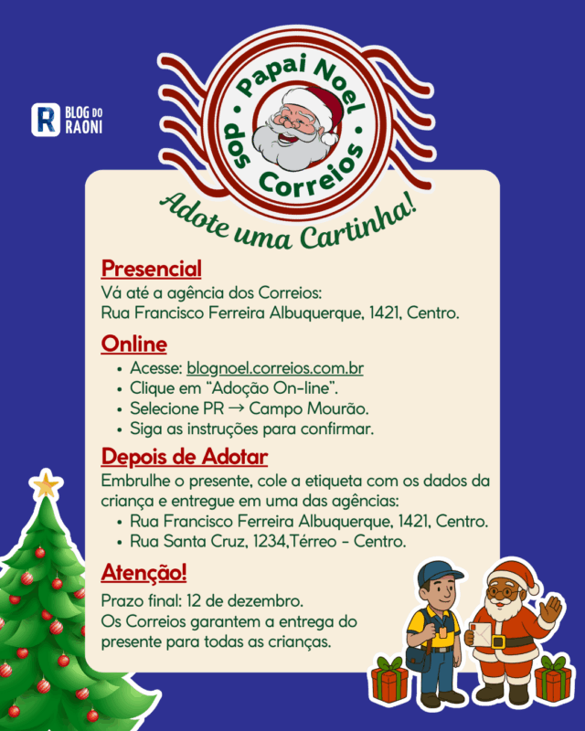 A magia do Natal já começou em Campo Mourão e, com ela, a oportunidade de transformar a vida de uma criança com um gesto simples, mas cheio de significado. A tradicional campanha Papai Noel dos Correios, que há 36 anos mobiliza o país, está em andamento no município e convida a comunidade a adotar cartinhas para realizar pequenos sonhos neste fim de ano.