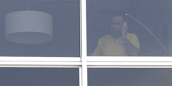 Aécio protesta contra a corrupção com camisa da CBF em um apartamento no Rio.