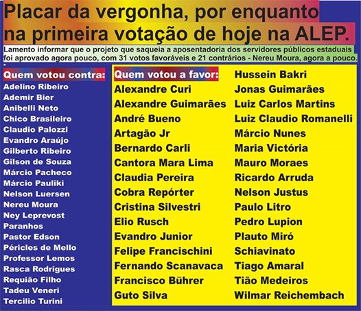 Na tarde desta última segunda-feira, com as galerias da “Casa do Povo” vazias, 31 deputados estaduais votaram com o governo a favor do PL 252 sobre a previdência. Apenas 21 foram contra.