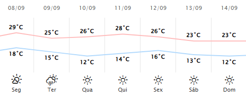 A segunda-feira (8), deve peranecer com o céu nublado durante todo o dia. As temperaturas ficam entre 18ºC pela manhã e chegam a 29ºC à tarde, sendo o dia mais quente da semana.