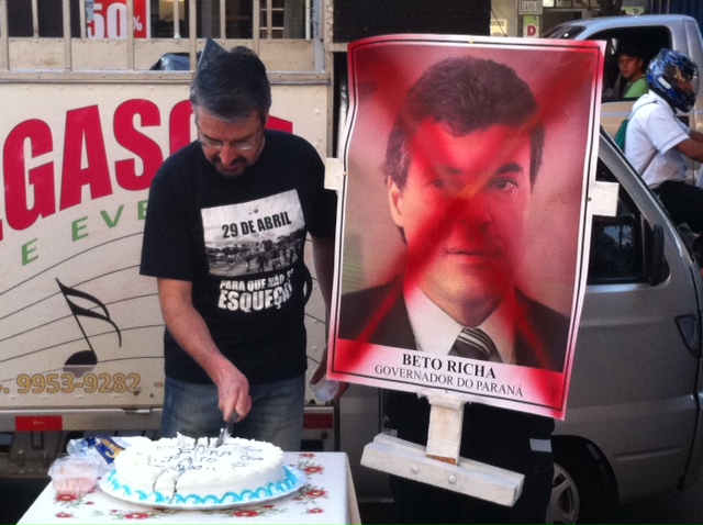Os professores “desparabenizaram” o governador, com direito a bola e tudo. No bolo estava a frase: “Fora Beto Richa”. Nos discursos os professores rememoraram as cenas de barbárie em Curitiba. O bolo foi cortado ao som de “O Beto Richa assim não dá, você quebrou o Paraná”.