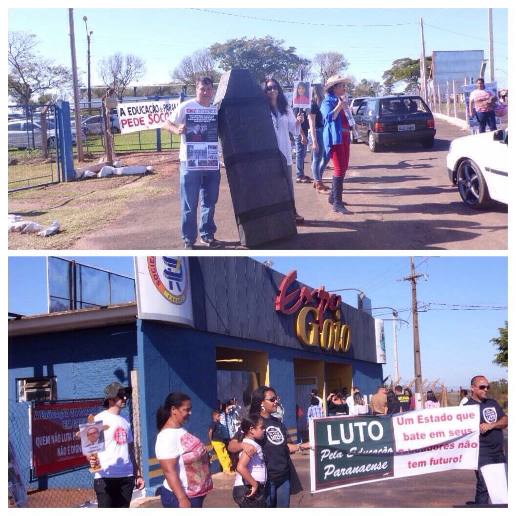 Professores e funcionários fizeram protesto em frente ao local da festa, com cartazes, cruzes com as fotos dos deputados da base do governo e também um caixão e mais uma vez afugentarão políticos da base do governo Richa.