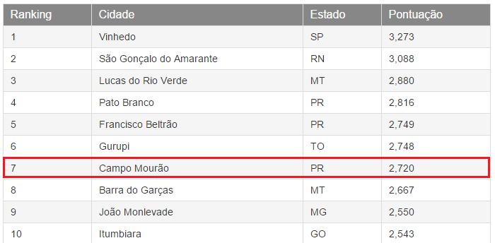 A revista Exame realizou fez um ranking com as 100 melhores cidades brasileiras entre 50 e 100 mil habitantes para se morar. O ranking faz parte de um estudo maior com a pesquisa “As melhores cidades do Brasil para fazer negócios”.