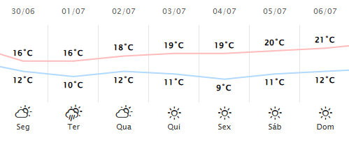 A quarta-feira (2) volta a ter céu nublado, mas sem previsão de chuva. A temperatura sobe um pouco, com mínima de 12°C e máxima de 18°C.
