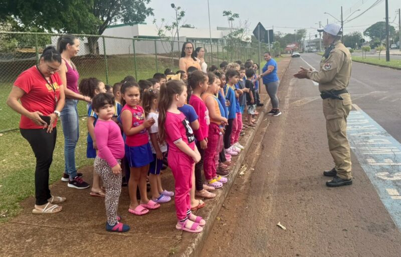 A manhã desta terça-feira (30) foi marcada por uma ação especial na Escola Municipal Professor Florestan Fernandes (CAIC), em Campo Mourão. Em parceria com o 11º Batalhão da Polícia Militar do Paraná, por meio do sargento Elias Bezerra, cerca de 60 alunos do Infantil 4 e 5 participaram de uma palestra educativa sobre trânsito, realizada dentro da programação da Semana Nacional do Trânsito.