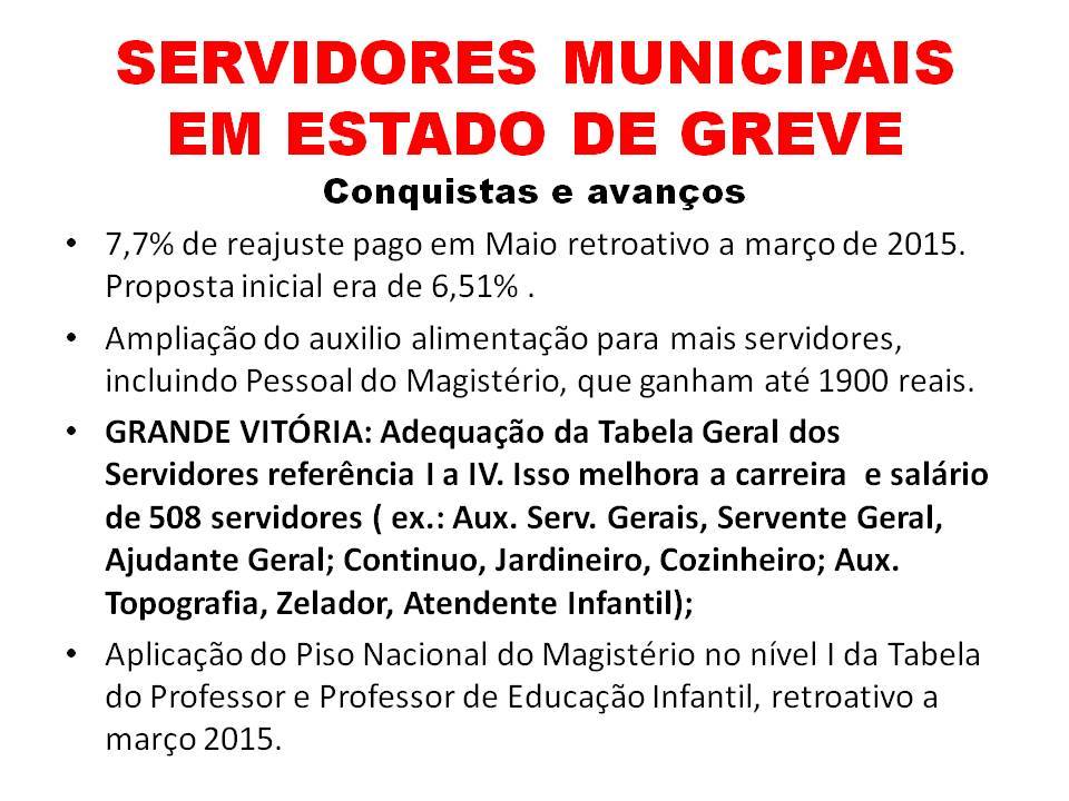 O Sindicato dos Servidores de Campo Mourão – SINDISCAM – reafirmou nesta última terça-feira que o movimento grevista foi sim vitorioso. Algumas das conquistas da greve foram postadas na rede social facebook para que todos pudessem avaliar (imagem do post).