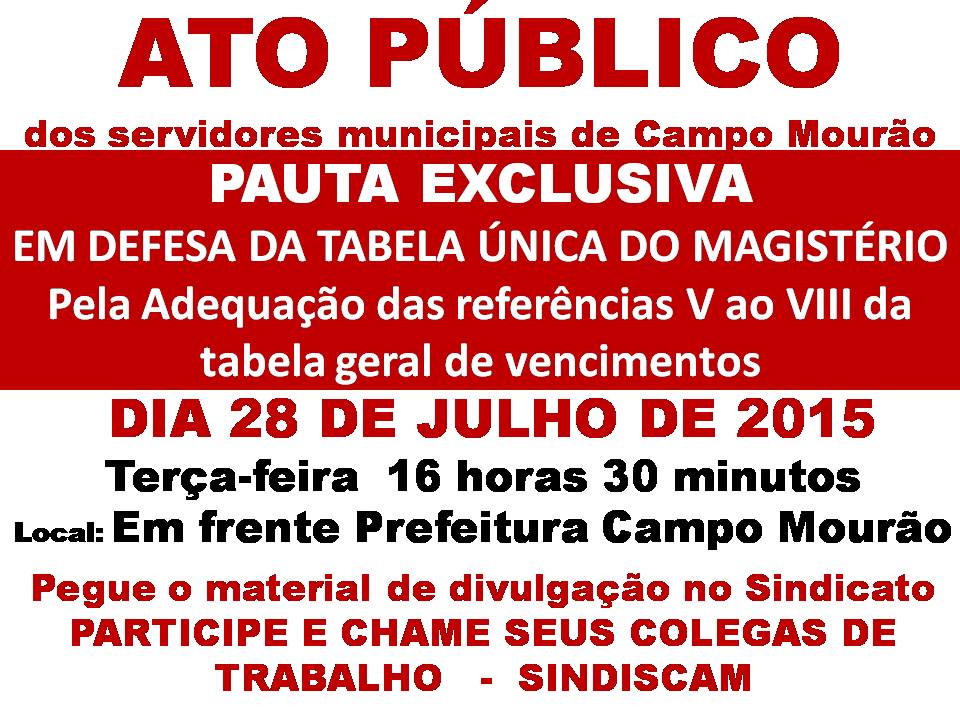 O SINDISCAM – Sindicato dos Servidores Municipais de Campo Mourão – organiza nesta terça-feira, um ato público em frente ao Paço Municipal 10 de Outubro. A mobilização está marcada para as 16h30 e tem como objetivo a defesa da tabela única do magistério.