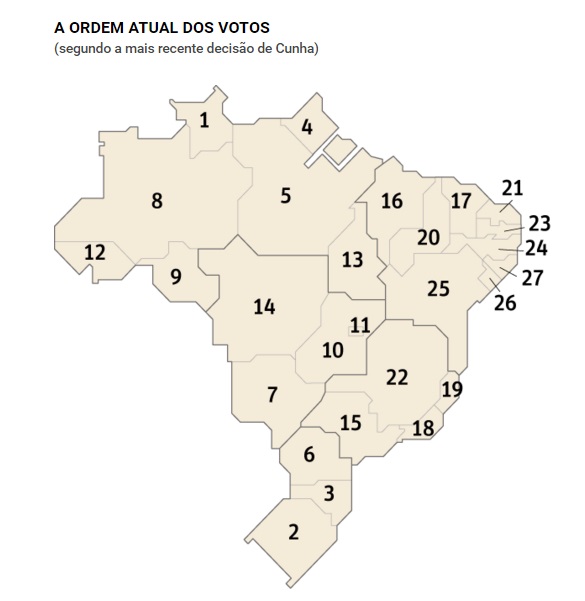 Outra queixa feita ao STF foi em relação a sequência de votação dos deputados. Em 1992, durante o processo de Impeachment do presidente Fernando Collor a votação foi por ordem alfabética. Inicialmente Cunha queria realizar a votação inciando pelo estados do Sul e Sudeste, majoritariamente favoráveis ao Impeachment. No entanto, o presidente da Casa recuou e fará a convocação variando entre Norte e Sul, como prevê o regimento.