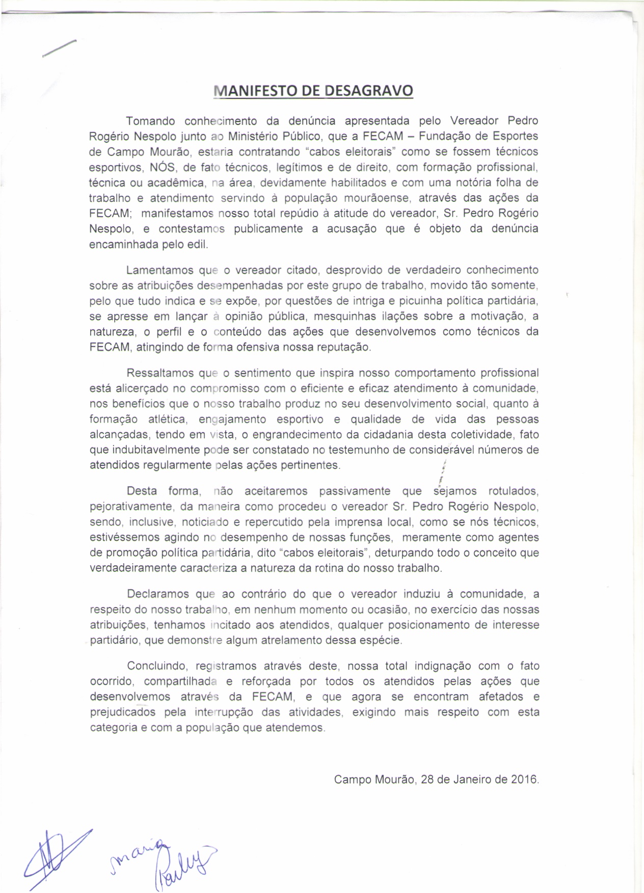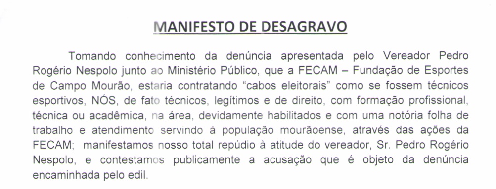Nesta quinta-feira, 28, os técnicos esportivos afetados pela situação, enviaram ao Blog do Raoni um “manifesto de desagravo” em que mostram o descontentamento e repúdio com relação a atitude do vereador: “Manifestamos nosso total repúdio à atitude do vereador, Sr. Pedro Rogério Nespolo, e contestamos publicamente a acusação que é objeto da denúncia encaminhada pelo edil”.